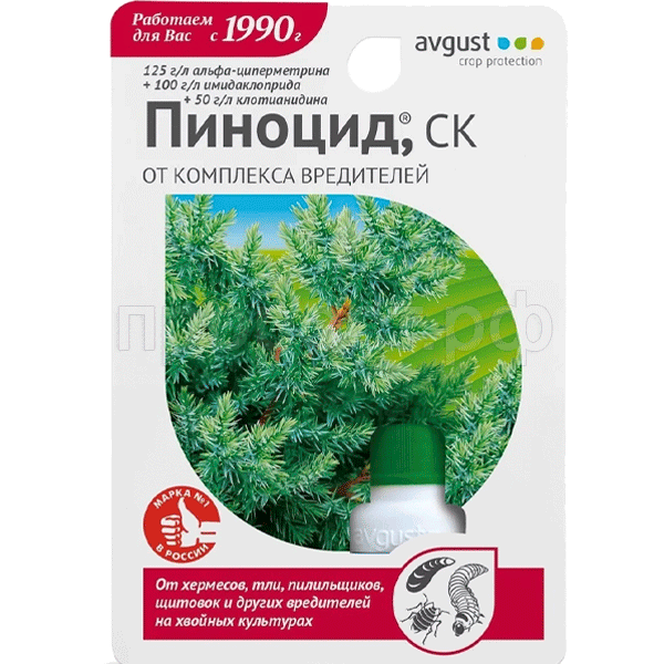Уничтожает хермесов, пилильщиков, тлю, щитовок, мучнистых червецов и различных гусениц за 24 часа!